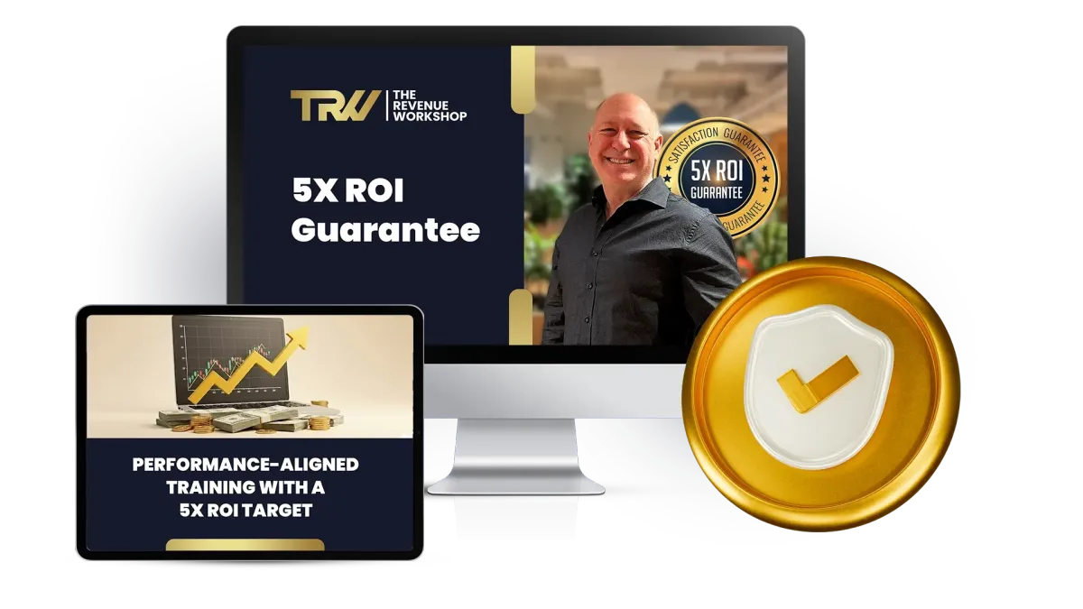 Once the training day is complete, we stay involved with structured check-ins at 30, 60, and 90 days to make sure new behaviors stick and results compound. Backing the entire engagement is our 5X ROI Guarantee, a performance-aligned goal of 5x or greater return on your training investment, with continued monthly support until you’ve beaten that goal.