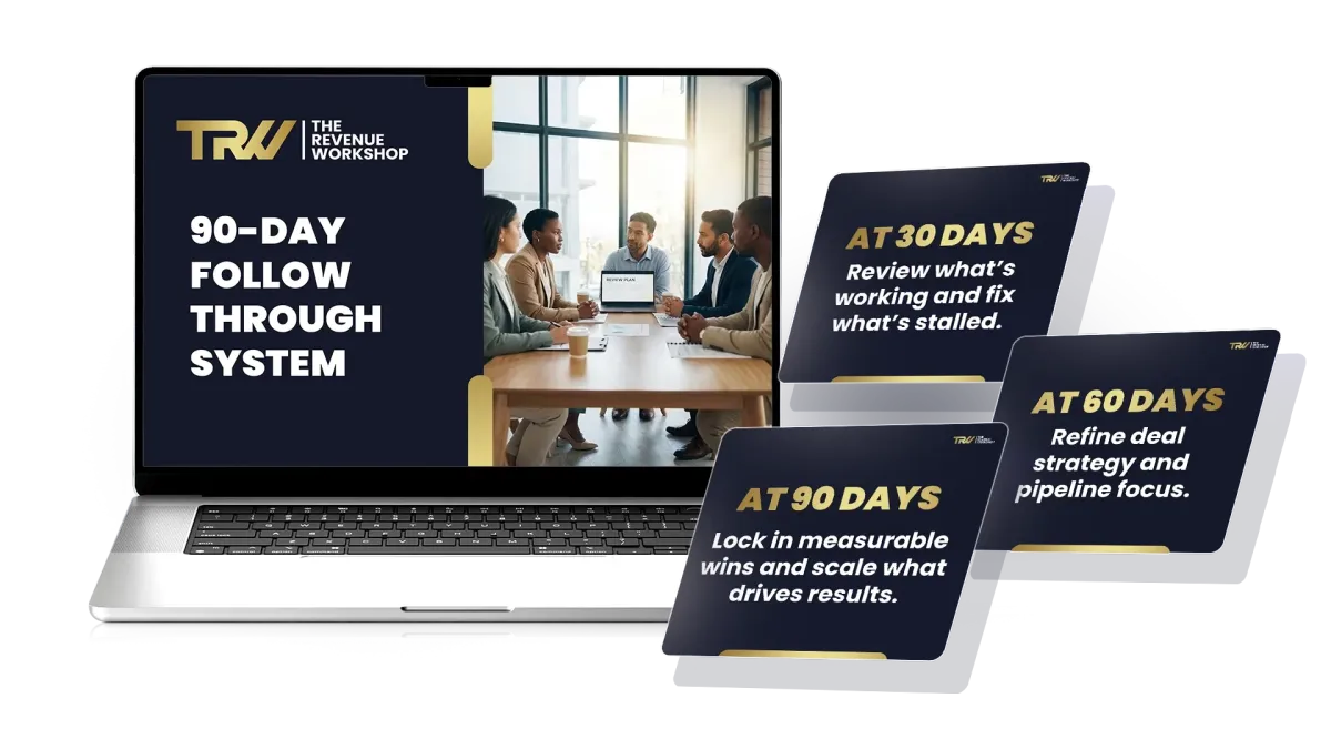 Unlike most training programs that end directly after the event, The Revenue Workshop includes structured check-ins at 30, 60, and 90 days. These sessions ensure new behaviors stick, pipeline strategy tightens, and measurable lift is locked in and scaled across the team. You are never left alone to figure out implementation on your own.